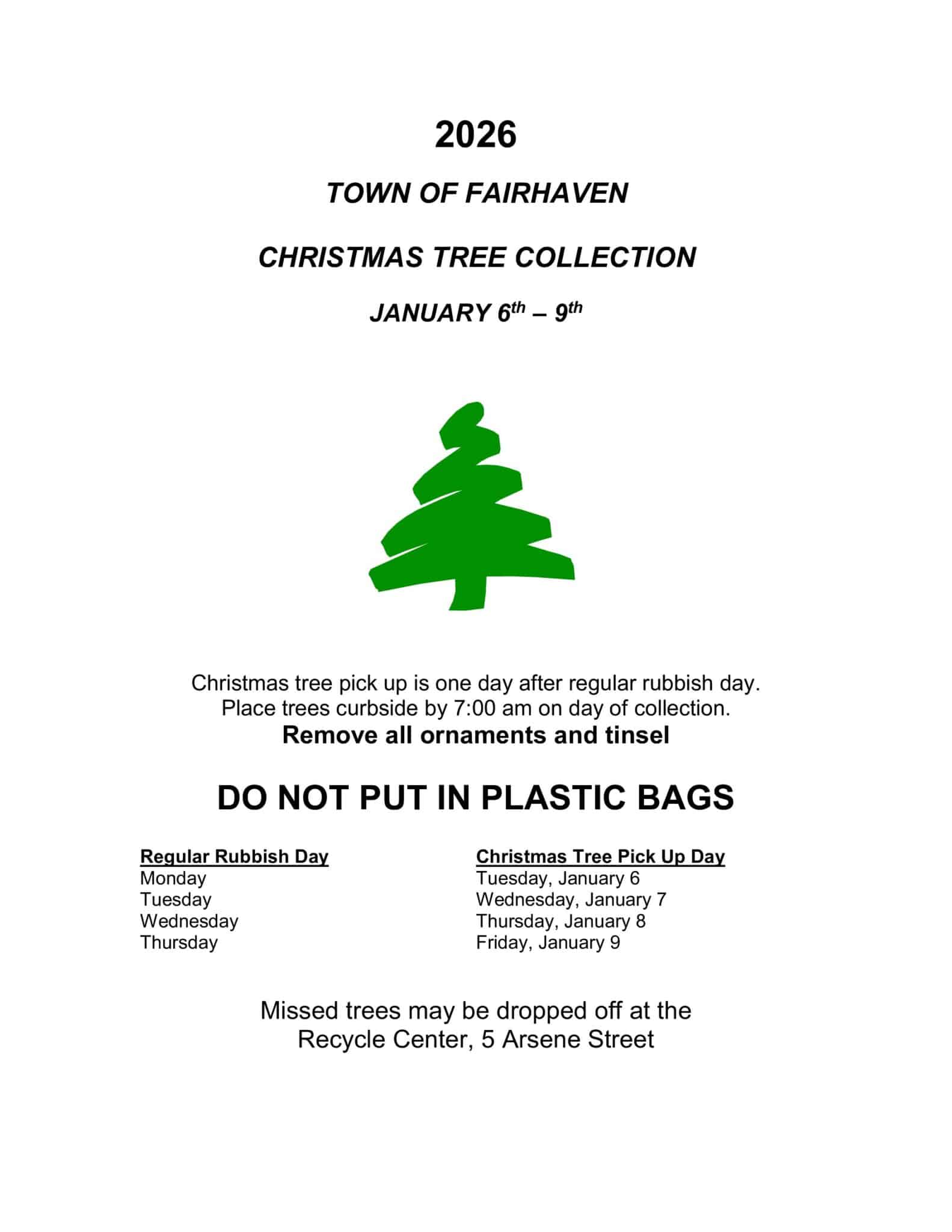 2026 Christmas Tree Collection December 23, 2025| News 2026 XMAS TREE POSTERDownload Post navigation Previous Previous post: Town Report – December 19, 2025Next Next post: 2026 Recycle Center Hours / Stickers