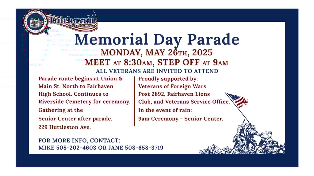 For further info contact Veterans Agent Mike Jenney (508-202-4603) or Jane Bettencourt (508-658-3719)