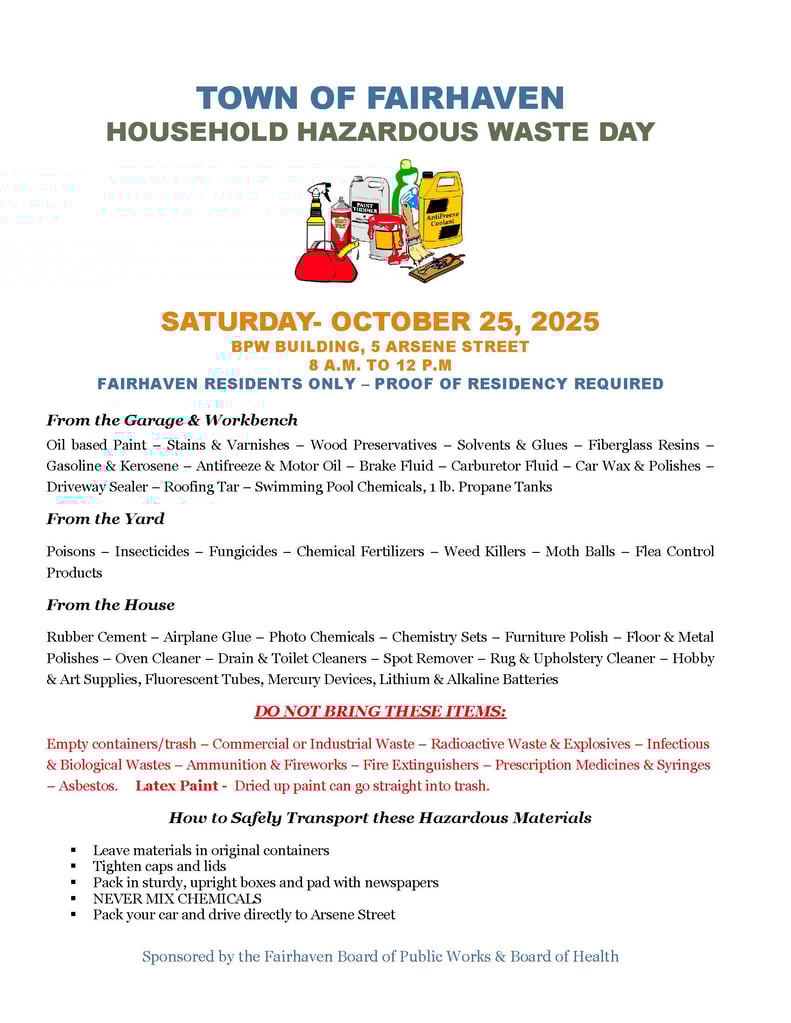 Town of Fairhaven Household Hazardous Waste Day Saturday, October 25, 2025 October 1, 2025| News Post navigation Previous Previous post: School Committee Volunteer OpportunityNext Next post: New Bedford / Fairhaven Harbor Plan Update